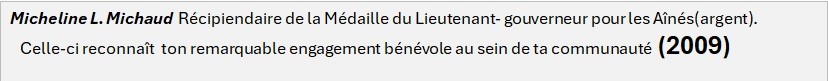 La médaille du Lieutenant-gouverneur reconnaît les aînés pour leur engagement bénévole soutenu au niveau social ou communautaire, qui a débuté ou qui s’est poursuivi au-delà de l’âge de 64 ans, et qui a contribué au mieux-être de leur milieu ou à l’accomplissement de la mission d’un organisme.