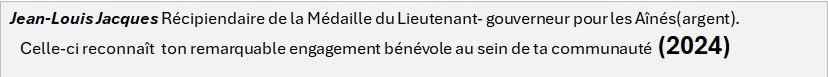 La médaille du Lieutenant-gouverneur reconnaît les aînés pour leur engagement bénévole soutenu au niveau social ou communautaire, qui a débuté ou qui s’est poursuivi au-delà de l’âge de 64 ans, et qui a contribué au mieux-être de leur milieu ou à l’accomplissement de la mission d’un organisme.